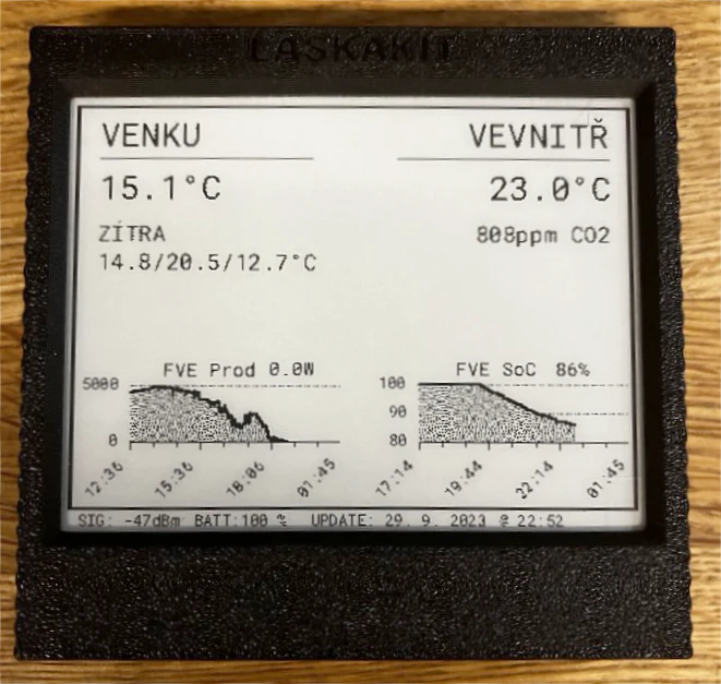 Kdyby šlo do zařízení poslat již sestavený obrázek z internetu, tak by to bylo daleko příjemnější. Pak se rozjel celý kolotoč myšlenek - co kdyby se zařízení uspalo na potřebnou dobu, kterou mu pošle server? Co kdyby se obrázek i tak překreslil pouze tehdy, když dojde k jeho změně? Co kdyby zařízení rovnou na server poslalo naměřenou teplotu, takže by mohlo sloužit jako domácí teploměr? Obrázek do zařízení by se mohl brát z galerie, nebo třeba z libovolného odkazu, nebo by se dala sestavit vlastní obrazovka s prvky, jak já budu chtít... totálně mě to pohltilo.
