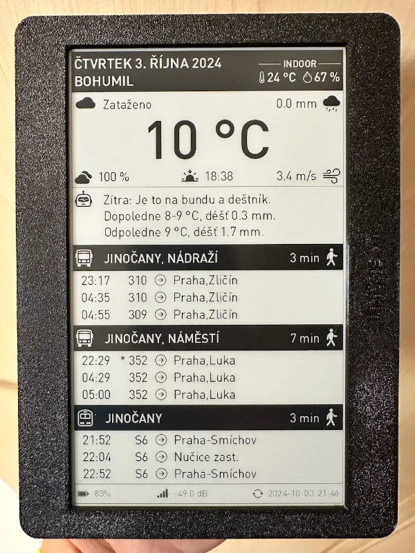 Odjezdy PID (Praha) a PMDP (Plzeň) přímo na e-ink displeji.