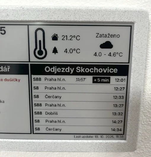 Odjezdy PID (Praha) a PMDP (Plzeň) přímo na e-ink displeji.