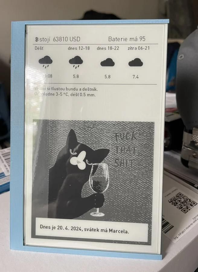 Tvůrce skvělé obrazovky s Počasím (viz galerie v účtu uživatele). Opravil firmware pro správné načtení obrazovky na horší konektivitě. Michal navíc má vlastní výborný open source software na správu ePaperů.