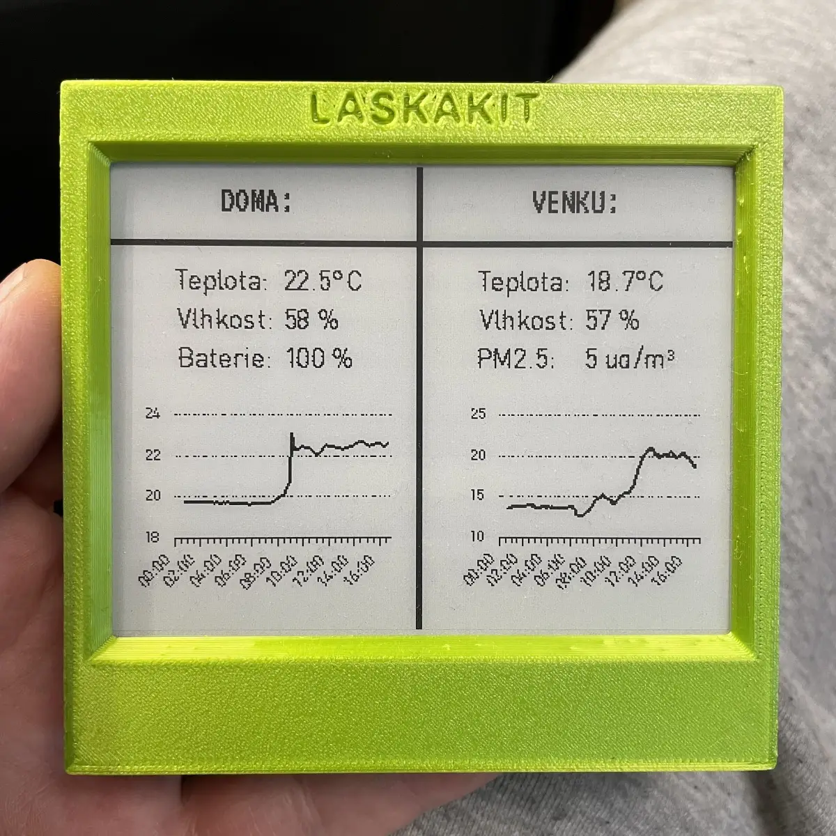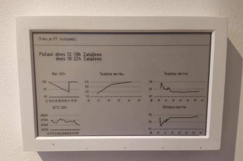 Kdyby šlo do zařízení poslat již sestavený obrázek z internetu, tak by to bylo daleko příjemnější. Pak se rozjel celý kolotoč myšlenek - co kdyby se zařízení uspalo na potřebnou dobu, kterou mu pošle server? Co kdyby se obrázek i tak překreslil pouze tehdy, když dojde k jeho změně? Co kdyby zařízení rovnou na server poslalo naměřenou teplotu, takže by mohlo sloužit jako domácí teploměr? Obrázek do zařízení by se mohl brát z galerie, nebo třeba z libovolného odkazu, nebo by se dala sestavit vlastní obrazovka s prvky, jak já budu chtít... totálně mě to pohltilo.