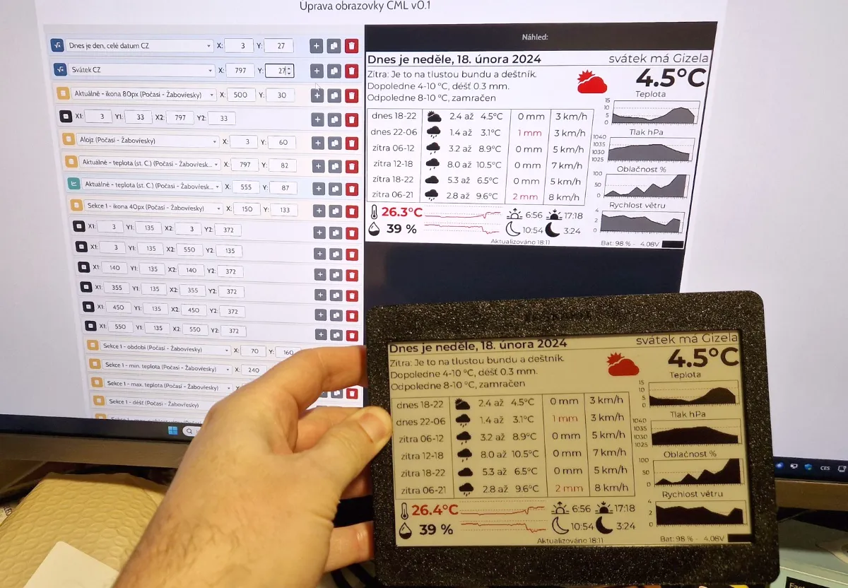 Tvůrce skvělé obrazovky s Počasím (viz galerie v účtu uživatele). Opravil firmware pro správné načtení obrazovky na horší konektivitě. Michal navíc má vlastní výborný open source software na správu ePaperů.