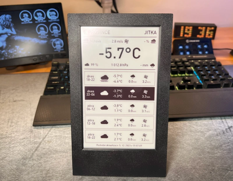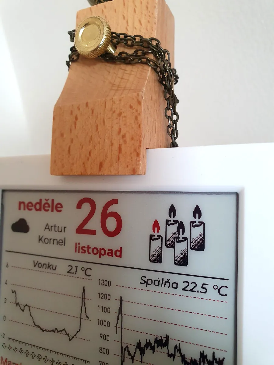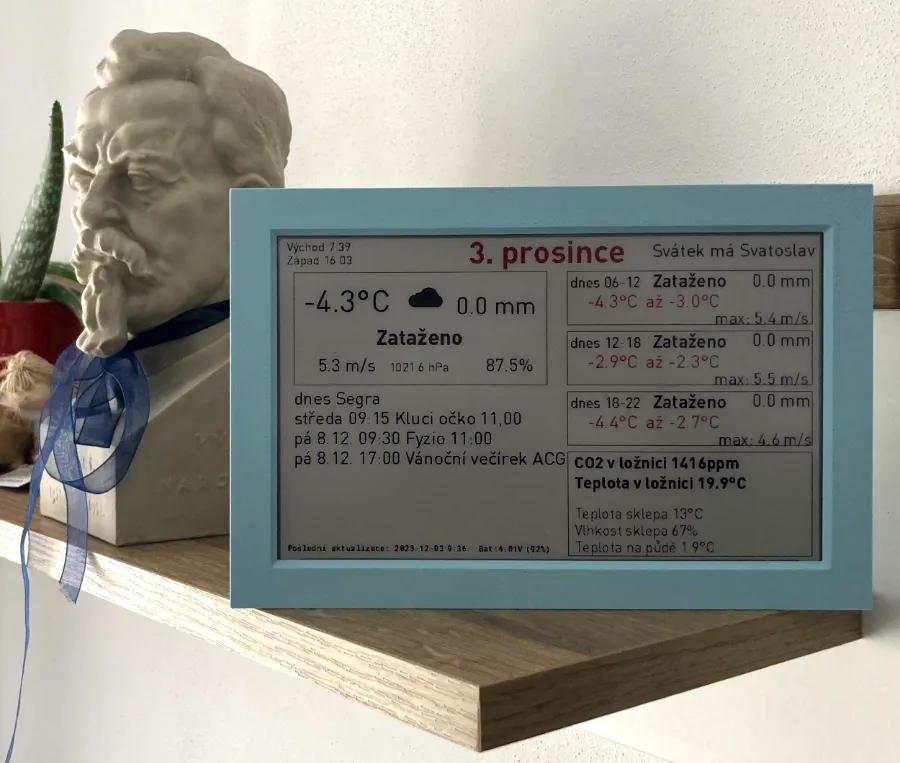 Kdyby šlo do zařízení poslat již sestavený obrázek z internetu, tak by to bylo daleko příjemnější. Pak se rozjel celý kolotoč myšlenek - co kdyby se zařízení uspalo na potřebnou dobu, kterou mu pošle server? Co kdyby se obrázek i tak překreslil pouze tehdy, když dojde k jeho změně? Co kdyby zařízení rovnou na server poslalo naměřenou teplotu, takže by mohlo sloužit jako domácí teploměr? Obrázek do zařízení by se mohl brát z galerie, nebo třeba z libovolného odkazu, nebo by se dala sestavit vlastní obrazovka s prvky, jak já budu chtít... totálně mě to pohltilo.