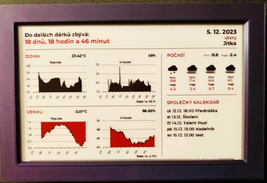 Zalíbila se mi možnost mít doma na zdi kalendář ve stylu hry Portal, který se nemusí často nabíjet a máte každý den něco nového. Představa, že se zobrazí například ještě počasí, svátky, naměřené hodnoty z čidel, a jiné mě ohromně lákala. Jenže jsem tyhle záležitosti nechtěl řešit přímo ve firmwaru vývojové desky, abych kvůli každé změně musel zařízení připojovat k počítači a znovu flashovat.