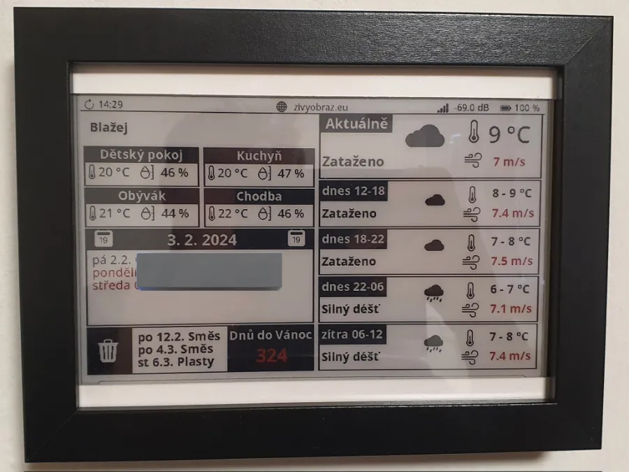 Kdyby šlo do zařízení poslat již sestavený obrázek z internetu, tak by to bylo daleko příjemnější. Pak se rozjel celý kolotoč myšlenek - co kdyby se zařízení uspalo na potřebnou dobu, kterou mu pošle server? Co kdyby se obrázek i tak překreslil pouze tehdy, když dojde k jeho změně? Co kdyby zařízení rovnou na server poslalo naměřenou teplotu, takže by mohlo sloužit jako domácí teploměr? Obrázek do zařízení by se mohl brát z galerie, nebo třeba z libovolného odkazu, nebo by se dala sestavit vlastní obrazovka s prvky, jak já budu chtít... totálně mě to pohltilo.